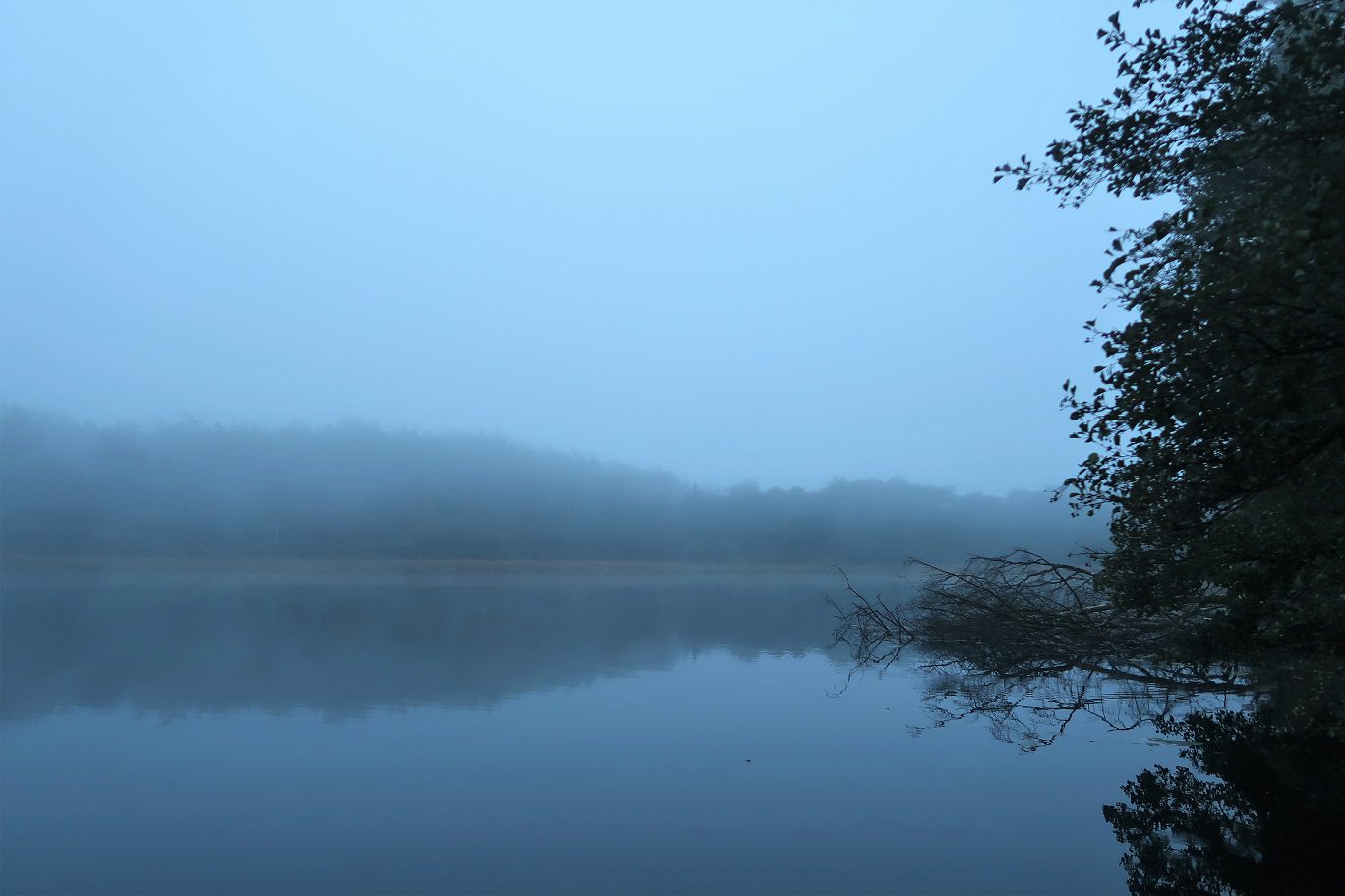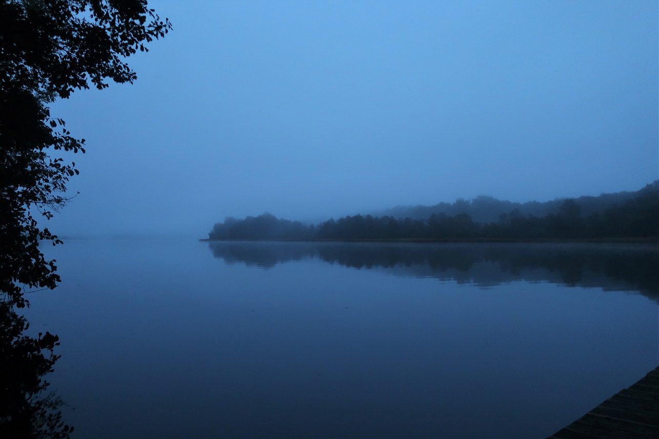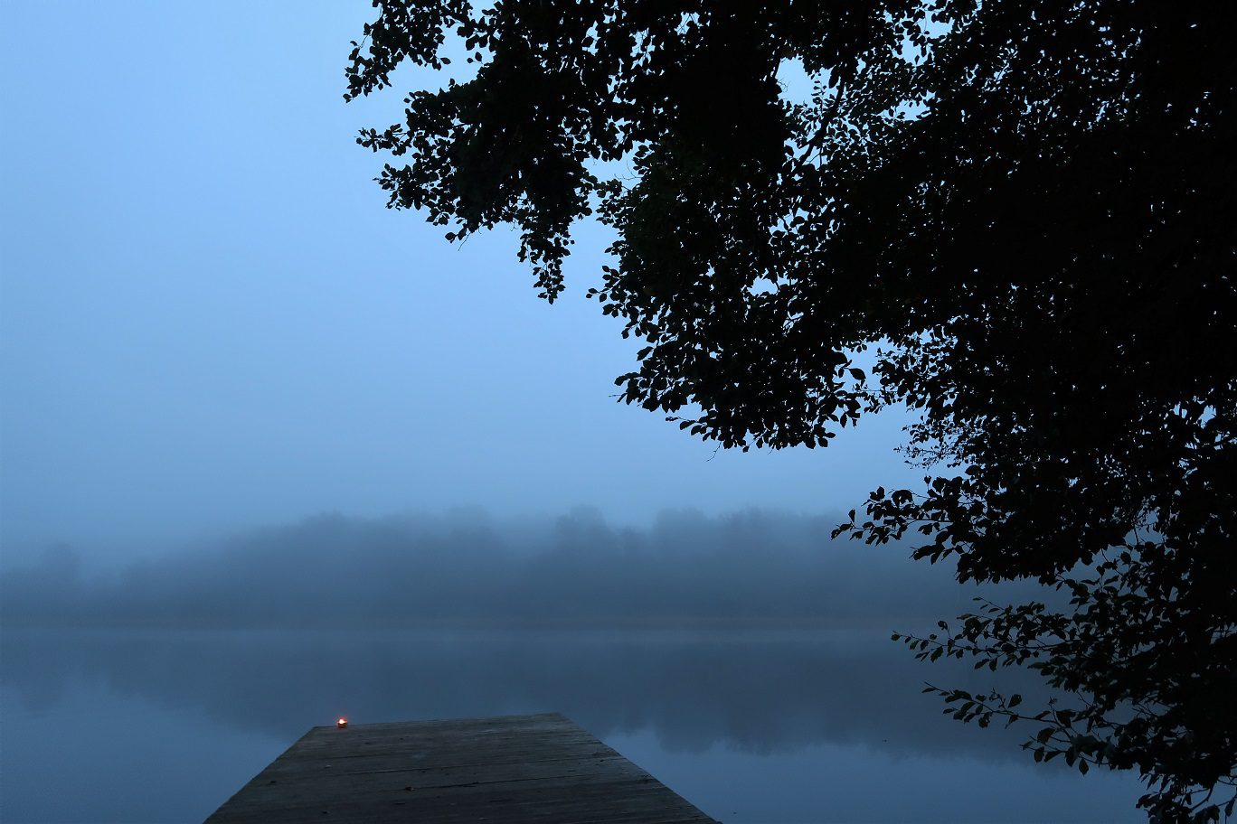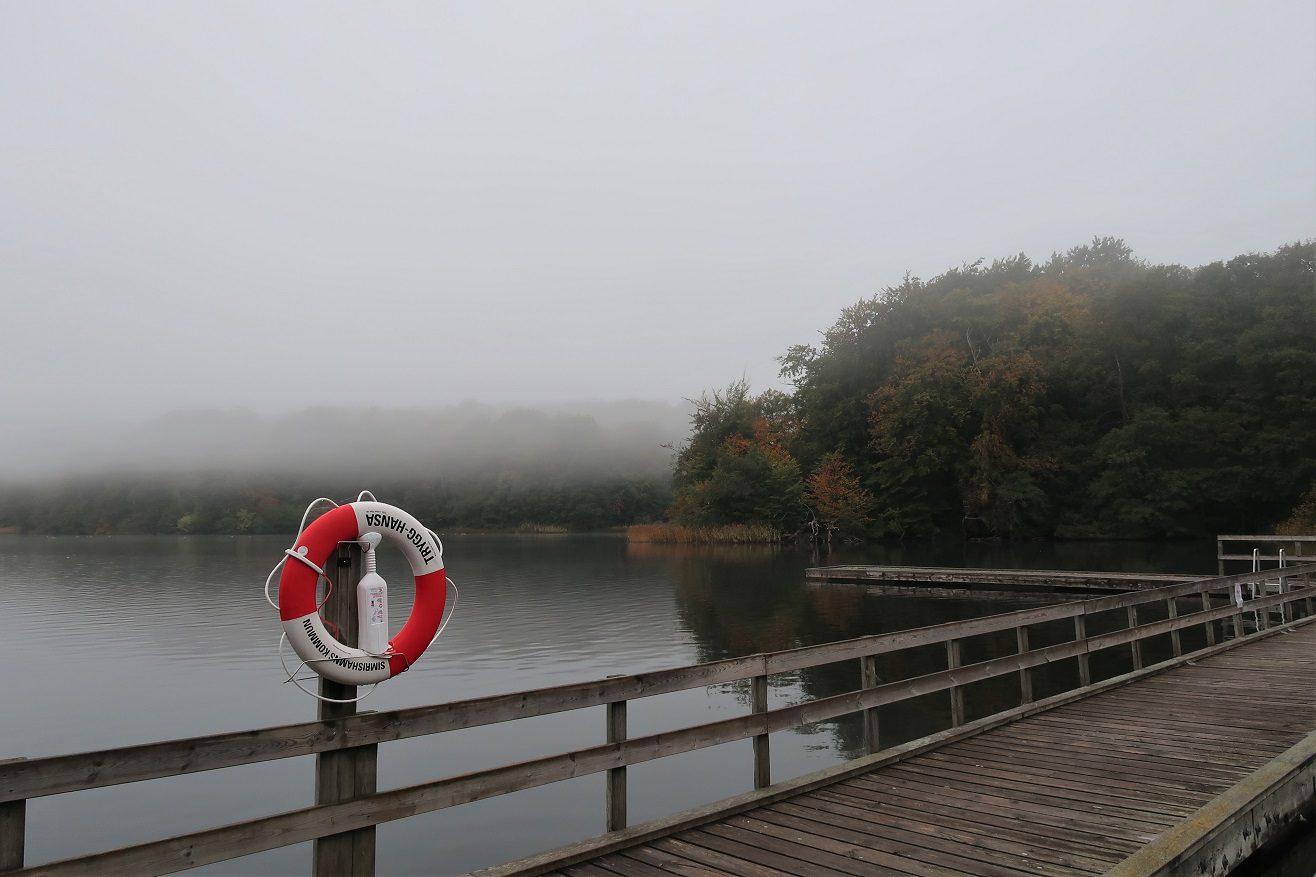 När jag kom ner till bryggan så var det både dimmigt och mörkt. Med hjälp av en tänd marschall skapade jag en underbart mysig stämning. Känslan av mystik var påtaglig. Att ta mitt friska dopp en sådan morgon slår nästan allting. Att simma runt i en svart sjö med en flammande marschall som enda ljuspunkt – det är magiskt! (särskilt som jag vet vilka djur som också finns i sjön… för nog skapar storgäddor, vattensnok och någon förmodad utter lite extra spänning i livet)